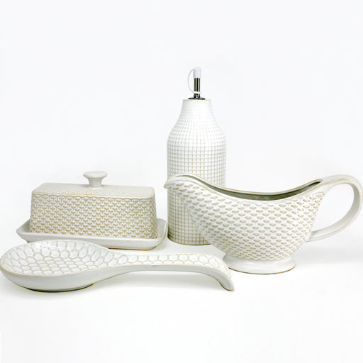 Textured Butter Dish, with cover, stoneware. The textured pattern of this butter dish offers a modern farmhouse appeal suitable for any occasion.