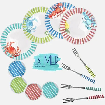 Seafood Plates, set of 4. 20 cm (8") dia, assorted colours. Porcelain. A colourful, sea-inspired collection set against a crisp white background...