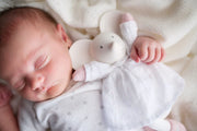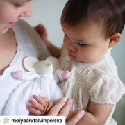 This adorable little mouse in a beautiful white dress is just the right size for baby's little hands. Mini Meiya is made of natural rubber and pure cotton components, making her super safe for your newborn or toddler. Her big ears are ideal for teething, with a soft body to give little fingers a secure grip. Meiya brings smiles to babies, and also to moms, who can feel relief that baby can teeth on a naturally safe product, and not a synthetic plastic.