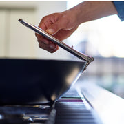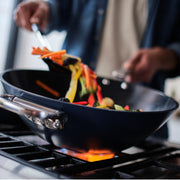 • Patented SwingLock™, folding stainless-steel handle saves up to 50% more space than a standard wok, when stored.