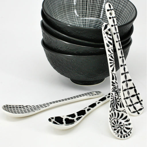 Set of 4 Condiment Spoons, 13cm, assorted patterns, black & white, new bone china. Ideal for dips, sauces, condiments, nuts and more. Microwav...