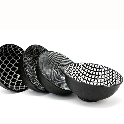 Small Bowls, 4 assorted patterns, 12cm / 300ml, black & white, stoneware. Ideal for dips, sauces, condiments, nuts and more. Microwave and dis...
