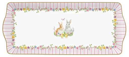 1 rectangular HAPPY EASTER cake plate with stripes, flowers and a rabbit motif in the center, made of porcelain.Dimensions: Height 2.5 cm, 35 x 15 ...