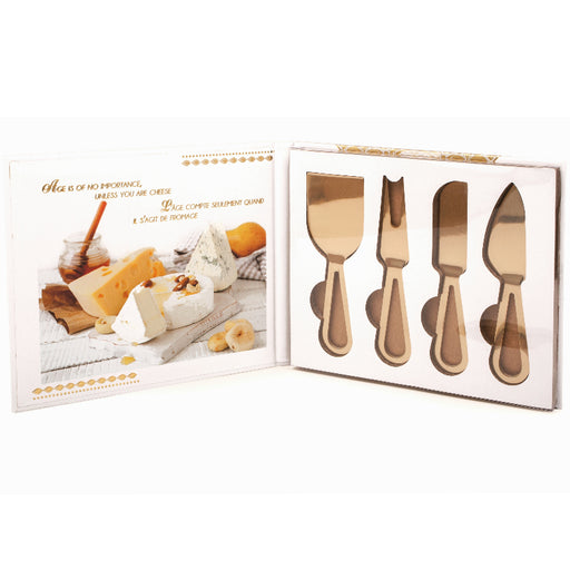 Set of 4 Cheese Knives, gold finished stainless steel. Includes 4 specialty knives for cutting through soft, medium and hard cheeses. Beautifully ...