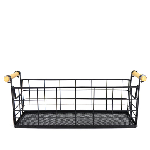 Organizer Basket with wood handles. 40 x 15 x 15cm H (16 x 6 x 6"), with wood handles. Ideal for kitchen and bathroom storage. UPC:Â 064081150252 ...