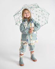 Pitter-patter, hands in pockets, feet in boots. The smell of spring is upon us; let's skip into the rain, mouth open catching every drop, and splash under the storm! Boots, hooded raincoats, overalls, and bucket hats— these new pieces are slipped on before “singing in the rain” and jumping into puddles. The clean cuts, soft tones, and cheerful prints from our Rainwear Collection will make frogs pale with envy and snails salivate with adoration.