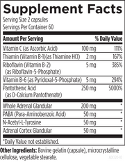 Adrenal Complex is a glandular-based product designed to support overall adrenal function.* Fortified with N-acetyl tyrosine, vitamin C, and a comprehensive spectrum of B vitamins, it is ideal for the support of a normal stress response due to its ability to help promote normal cortisol metabolism and catecholamine production (dopamine, norepinephrine, and epinephrine).*