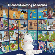 - 5-in-1 Sound Story Projector - In addition to the story projector function of audio and picture synchronization, it also has a night light mode (tap the machine twice to wake up), a sleeping lullaby mode(5 soothing music), an atmosphere starry sky light mode, and the cartoon rabbit that can be used as your boys and girls toy.