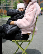 - Snapped system for leg muff corners and hood allowing for carrying baby facing outward or inward