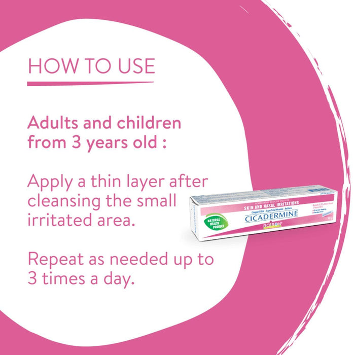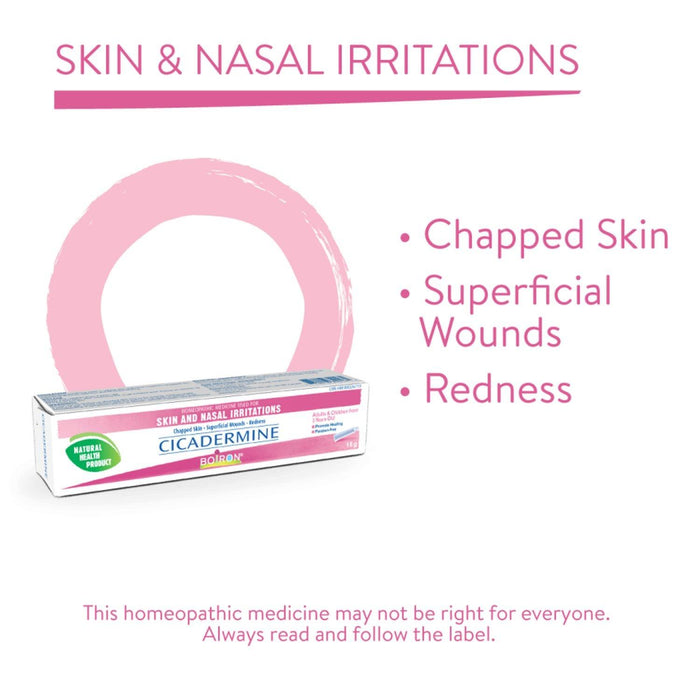 Cicadermine provides relief for skin and nasal passage irritation and is made with plant extracts to soothe irritated skin and mucous membranes. Cicadermine can be used to relieve dry, and red skin around the nose during cold or allergy season, as well as in the treatment of chapped lips, and dry cuticles. Cicadermine is a homeopathic medicine used to relieve skin and nasal irritations (chapped skin, superficial wounds, redness) and facilitate healing. [OINTMENT]