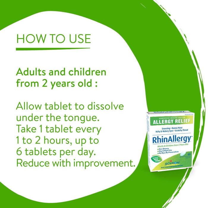 Rhinallergy from Boiron helps to relieves symptoms caused by seasonal allergies (hay fever and pollen) and environmental allergens (dust, mold and animal hairs), such as sneezing, runny nose, itchy, watery eyes, and scratchy throat. Start taking Rhinallergy at the first sign of allergy symptoms. Rhinallergy is a non-drowsy medicine that is antihistamine-free. [TABS]