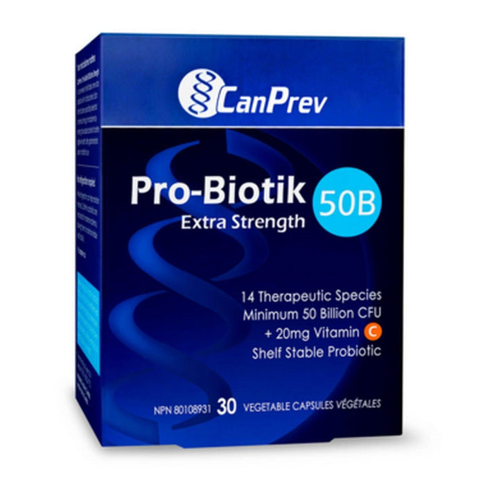 CanPrev’s Pro-Biotik 50B Extra Strength is a convenient, shelf stable, one-a-day probiotic with 14 clinical strains. Each strain has been specifically selected to enhance the gut microbiome by restoring favourable bacteria for better digestive health after gastrointestinal upset or antibiotic use. Keep a box of Pro-Biotik 50B in your bag and know with confidence that your probiotics can keep up, wherever life takes you.