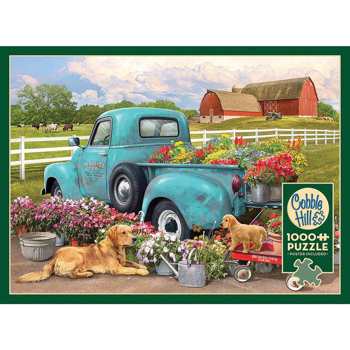 Object: Put together the jigsaw puzzle. Adorable dogs soak up the sun on this beautiful day at Orchard View Farms. The Flower Truck is officially open for business. Enjoy all 1000 pieces of this floral delight!