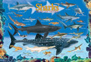 Dive into a world of incredible marine life with this Eurographics 100-piece puzzle. Designed for ages 5 and up, this puzzle showcases a stunning variety of sharks, each one labeled with its name. From the mighty Whale Shark to the speedy Thresher Shark, it's a fun and educational activity that will captivate any young ocean enthusiast.