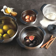 • The set includes two stainless steel, non-slip mixing bowls (500 ml & 4.5 L); a fine stainless-steel sieve; a 3 L stainless-steel colander; and a set of five measuring tools ranging in size from 5ml (1-tsp) to 250ml (1-cup).