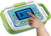 Learning fun is a tap away with the 2-in-1 LeapTop Touch. Kids can learn about letters, numbers, music and more on a laptop that's made just for them. Open the laptop to see the screen in keyboard mode, then close the laptop and watch the screen magically swivel into tablet mode. The laptop features an A-Z keyboard and number buttons 1-10, while the tablet features a touch screen. Kids will have fun pretending to email Scout, or tapping away in ABCs, Numbers, Games, Music and Messages modes. Plus, the laptop can be customized to help your child learn to spell their name. The take-along handle makes it great for learning on the go! Intended for ages 2-5 years. Requires 3 AA batteries. Batteries included for demo purposes only. New batteries recommended for regular use.