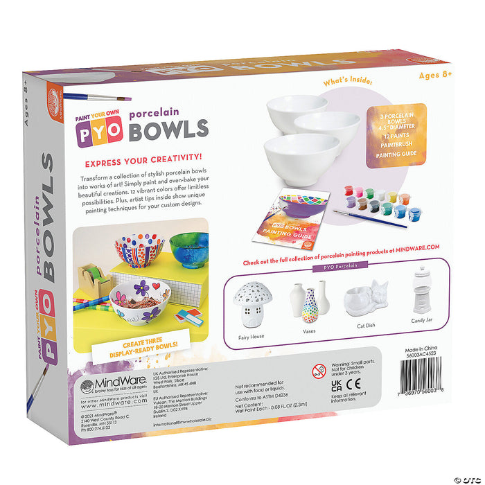 aint Your Own Porcelain Bowls is a one-of-a-kind art project. Design your own creations then oven-bake for a glossy, display-worthy finished product. Full-color instructions show you how to create the artistic effect you want—color mixing, brushing, sponging and more!With three bowls in a set and a variety of ways to use them, the possibilities are endless! Celebrate birthdays, themed holidays and special occasions with your own designs. Use as a decorative item for around the house or as a personal gift from the heart. Put jewelry, change or trinkets in bowls that measure 4 ½ inches in diameter. Expand your creativity and take your painting to the next level with Paint Your Own Porcelain Bowls! (Paint Your Own Porcelain products are intended to be display pieces only and are not created to withstand washing.)• Teaches creativity, hand-eye coordination, color-mixing, and fine motor skills • Paint and bake for a personalized craft you can display• Use for your next family project, at the next play date or as a gift• 3 high-quality porcelain bowls, 12 colors of paint, and paint brush