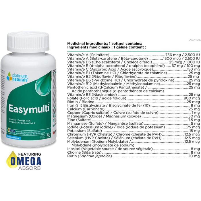 With the complete spectrum of vitamins and minerals, Platinum Naturals EasyMulti helps you meet your daily nutritional requirements. Multivitamins and minerals are more important today than ever before. Declining nutrient values in fruits and vegetables, combined with increased exposure to pollution and stressors, have seriously diminished the quantity and quality of nutrients in our diet. EasyMulti contains essential vitamins and minerals, plus a booster of Omega 3 & 6, all in a one-a-day softgel. [SOFTGEL]