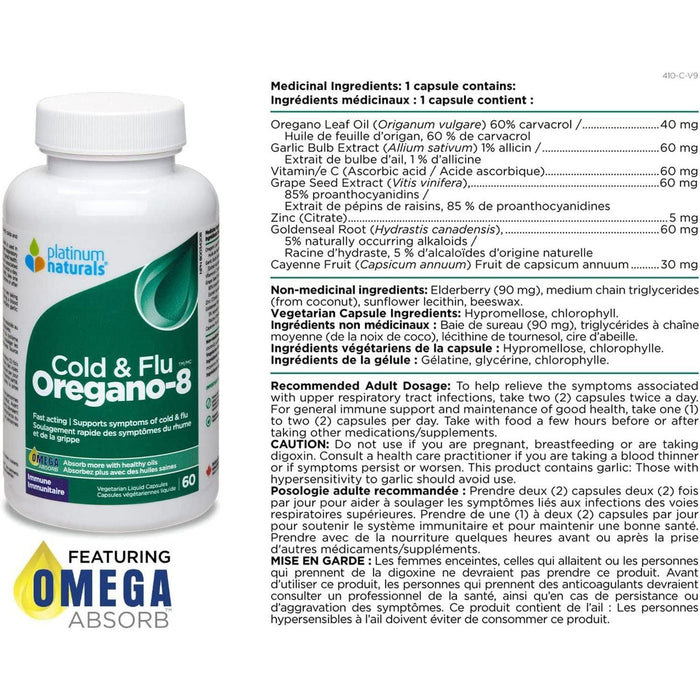 Platinum Naturals Oregano-8 Cold and Flu works to stop common colds and flu before they start. With its synergistic blend of ingredients, Oregano-8 from Platinum Naturals is fast and effective at fighting colds and flu, and also helps prevent them. You can count on Oregano-8 to attack the infection while supporting and strengthening your immune system. [LIQUID VCAPS]